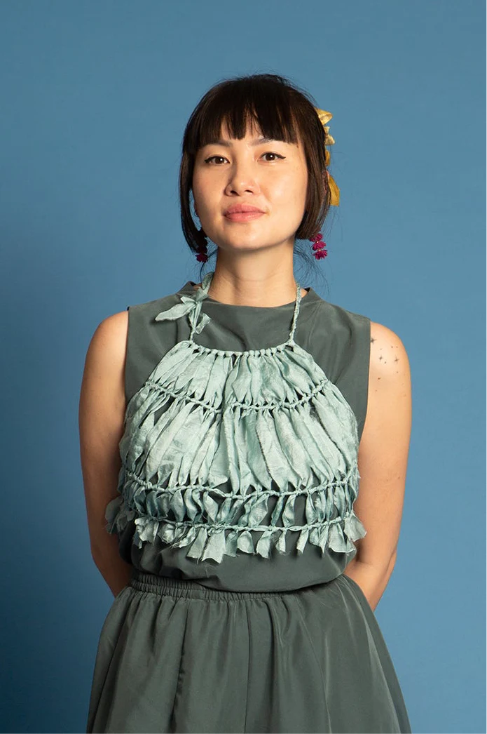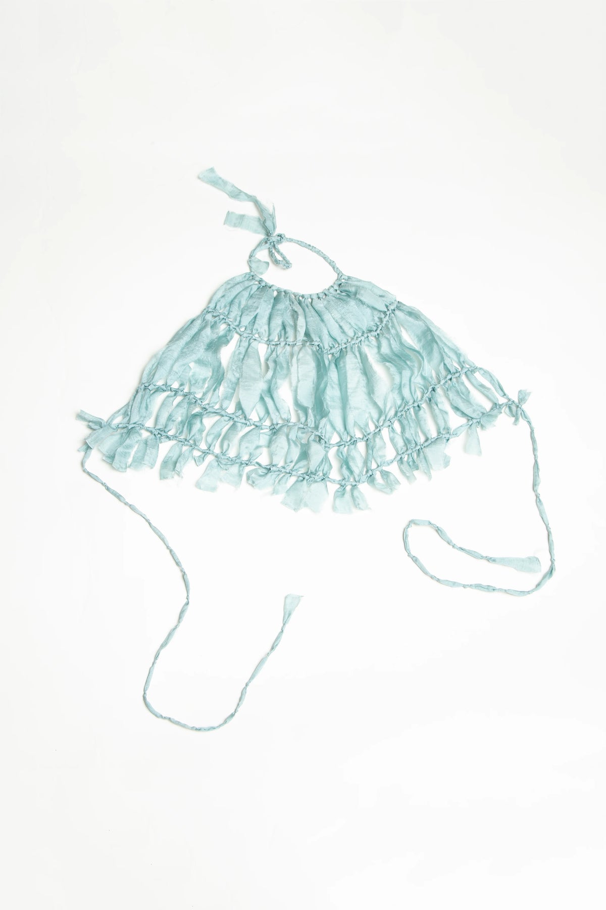 unit price perthe kaarem connect 2 handknitted silk cropped halter tie top is inspired by the traditional vietnamese “yếm” top, once an essential undergarment in vietnamese wardrobes. hand-knitted from 100% silk remnants collected in their studio, this piece highlights both meticulous craftsmanship and a commitment to sustainability. lightweight and breathable, this top can be styled on its own or layered for a variety of looks. adjustable.