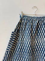 the tilda skirt indigo small rectangle by happy french gang is a lightweight, easy piece crafted from 100% natural hand-woven cotton. featuring an small rectangle indigo check, each skirt is hand-block printed and woven by artisans in their cooperative in india. the soft cotton feels effortless against the skin, with subtle texture that speaks to the care behind every detail.