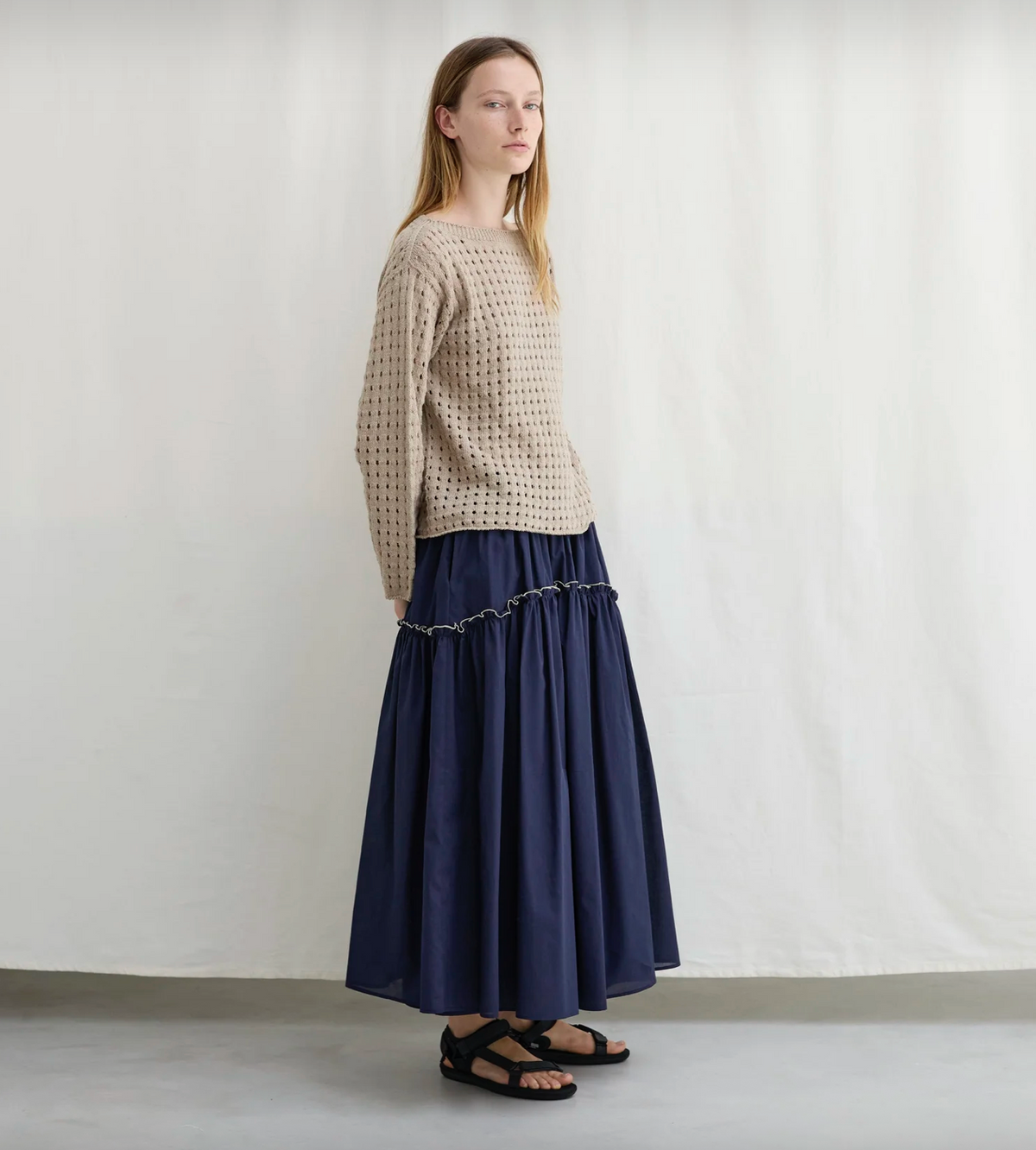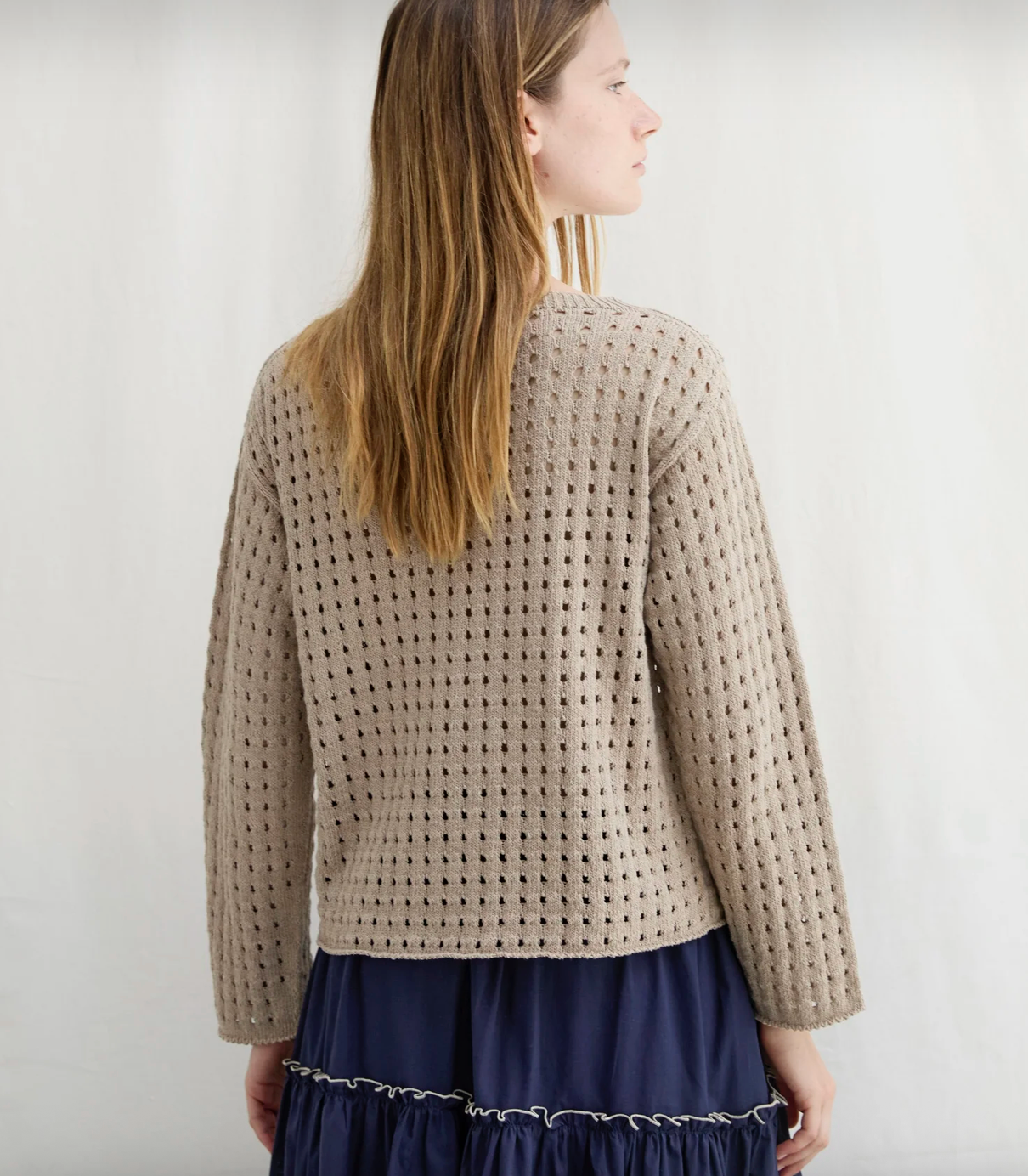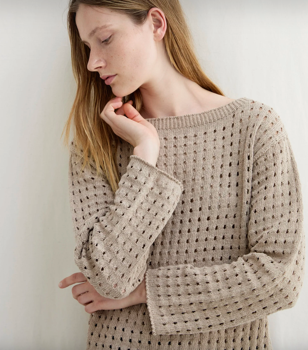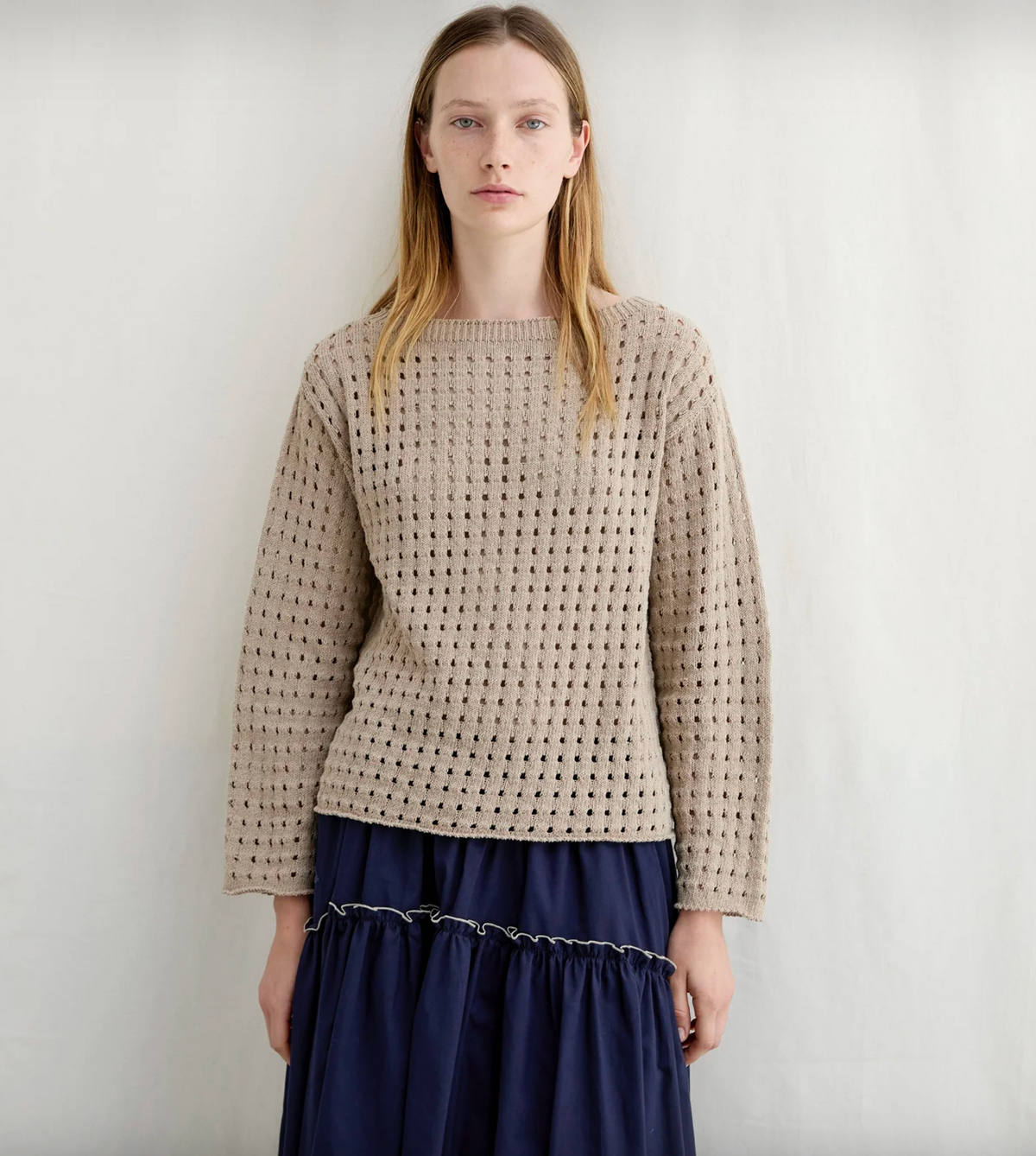 unit price perthe astro oatmeal sweater by diarte is a relaxed-fit sweater with a bold open-knit texture featuring a boat neckline and raw edges. thiis piece is knitted using 3D technology and has no seams adding comfort to it. the recycled cotton yarn used and the breathable texture makes it perfect as a summer layer through the season.
