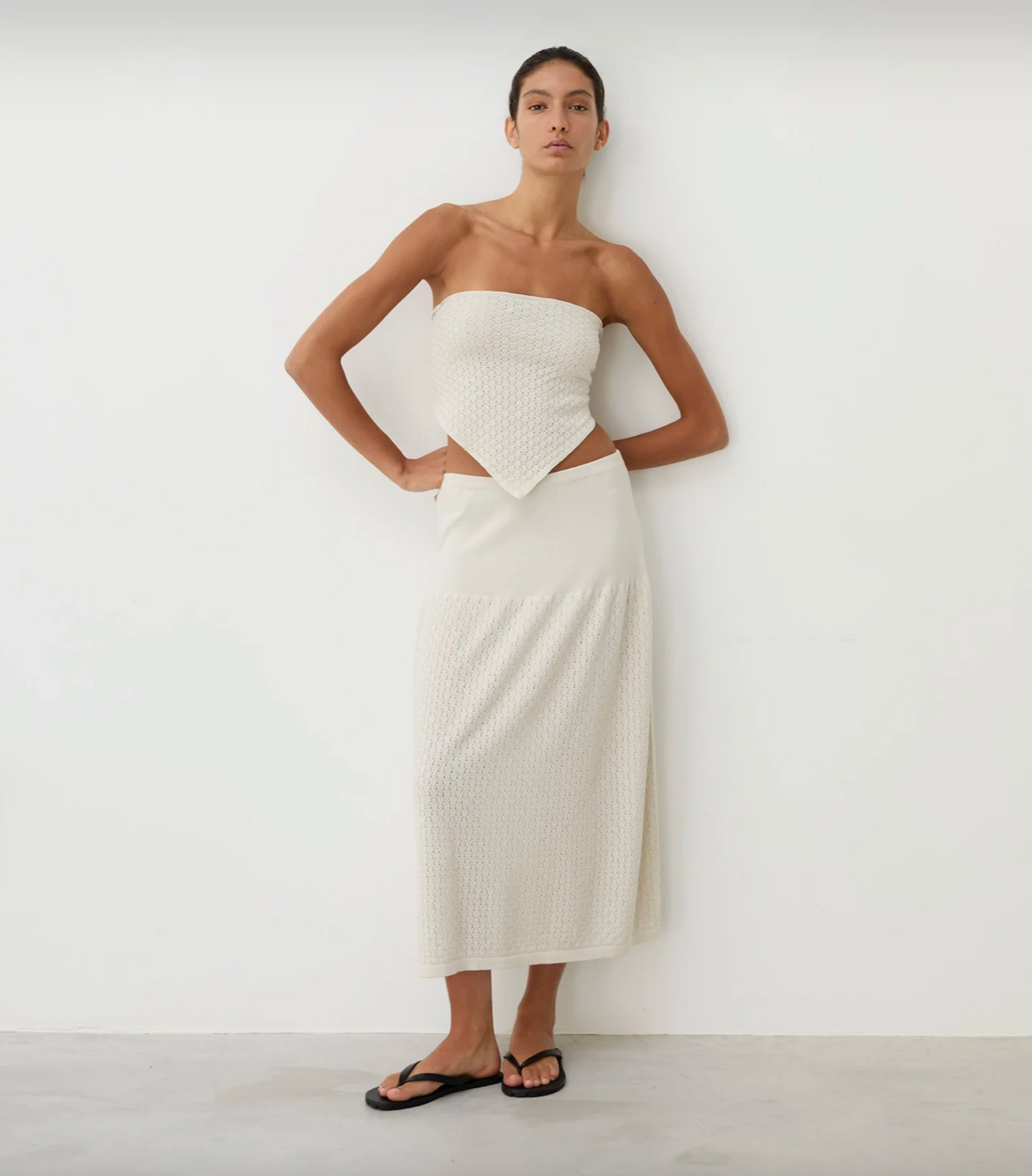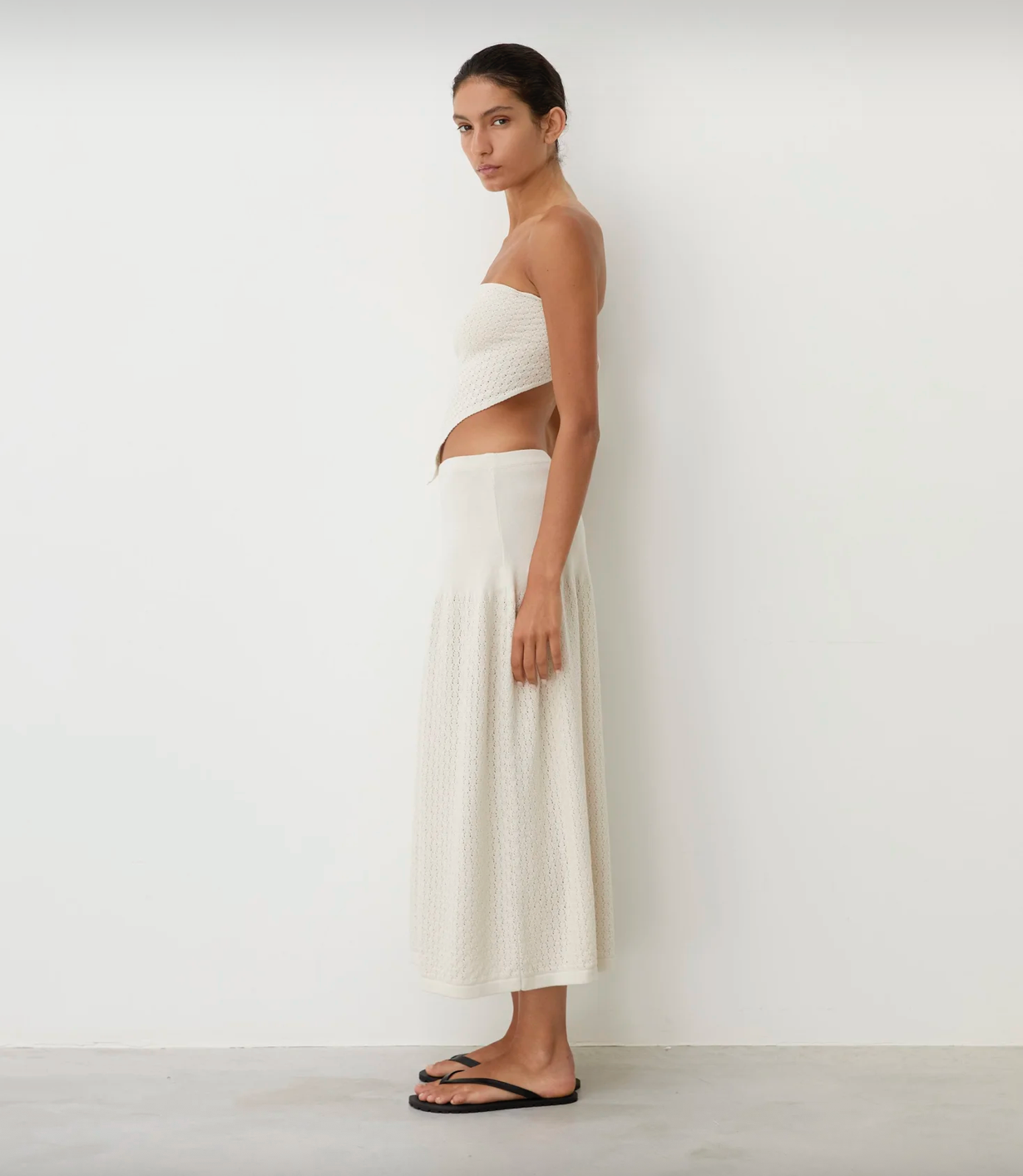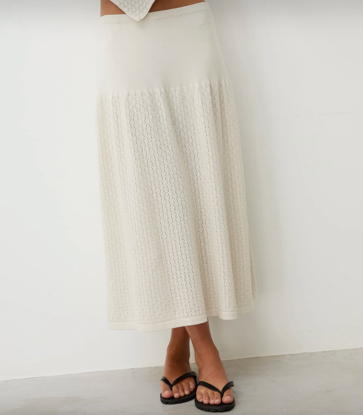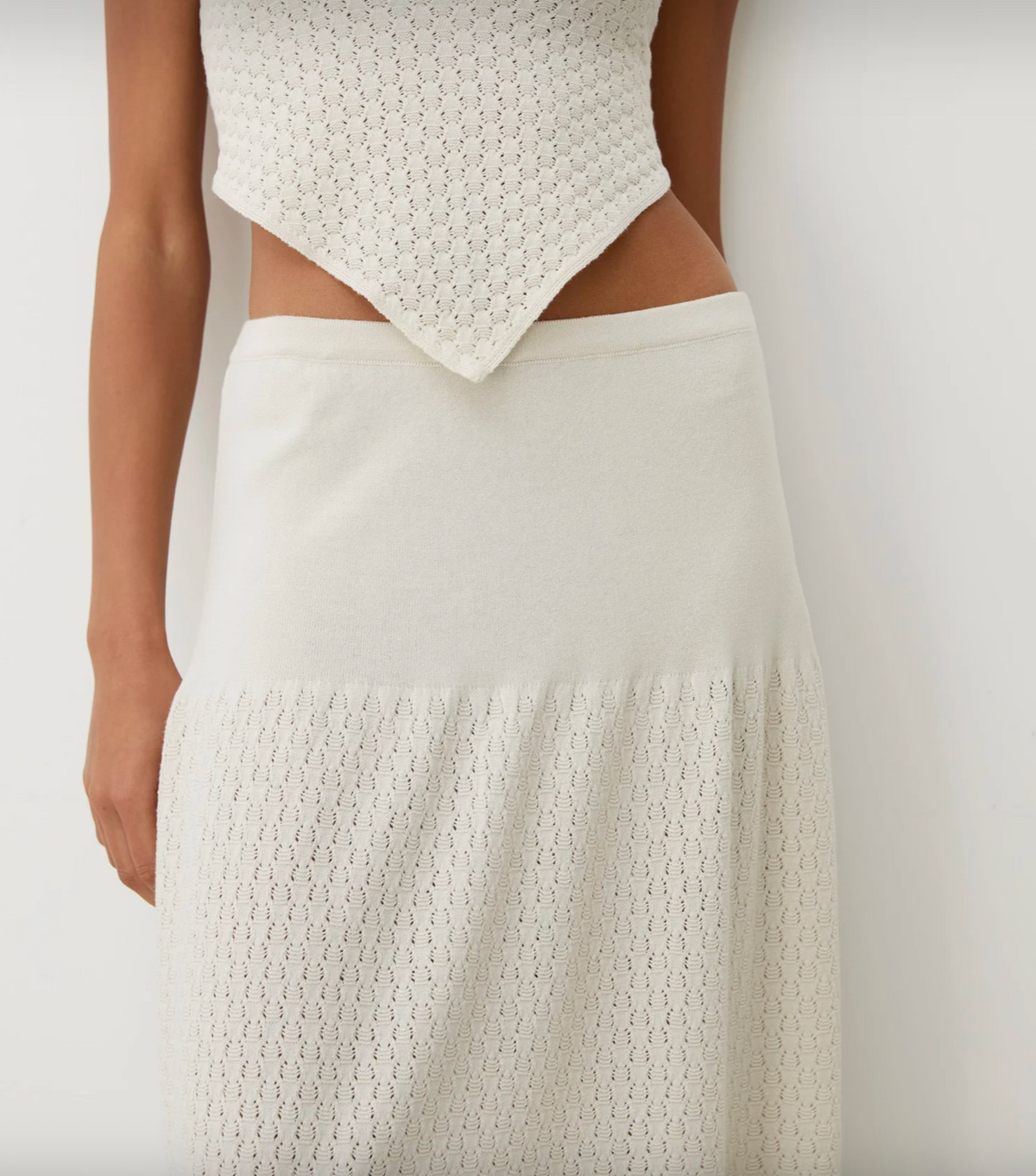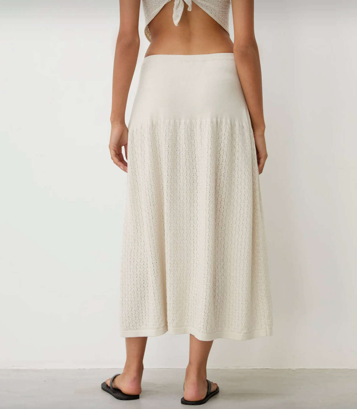 the cora white smoke skirt by diarte is a relaxed knitted skirt with an elasticated waistband that flows into a voluminous delicate lace texture. knitted from superior egyptian cotton yarn, it combines gentle shaping with a breathable texture for a feminine summer piece.