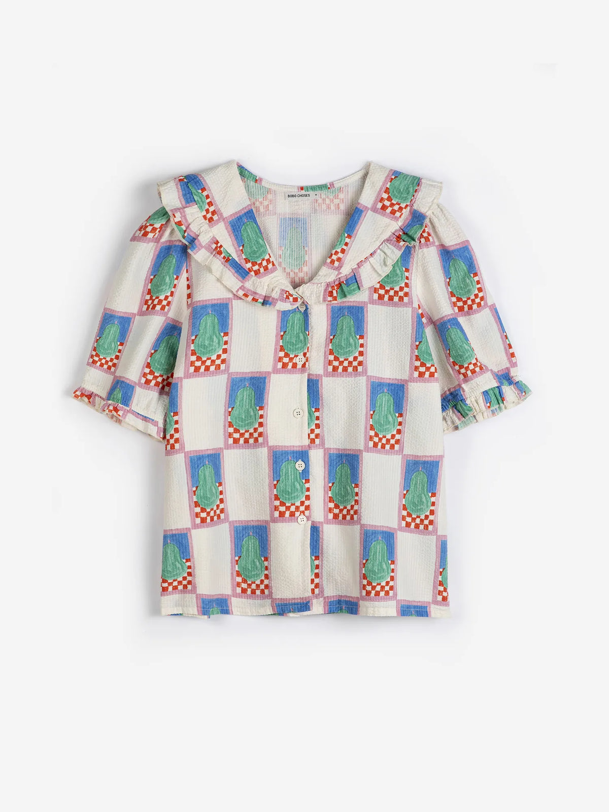unit price perthe pear pattern collar shirt by bobo chosen is crafted from cotton with an easy, relaxed fit and structured non-stretch fabric. playful yet polished— pair it with the pear pattern evasé skirt for a matching set.