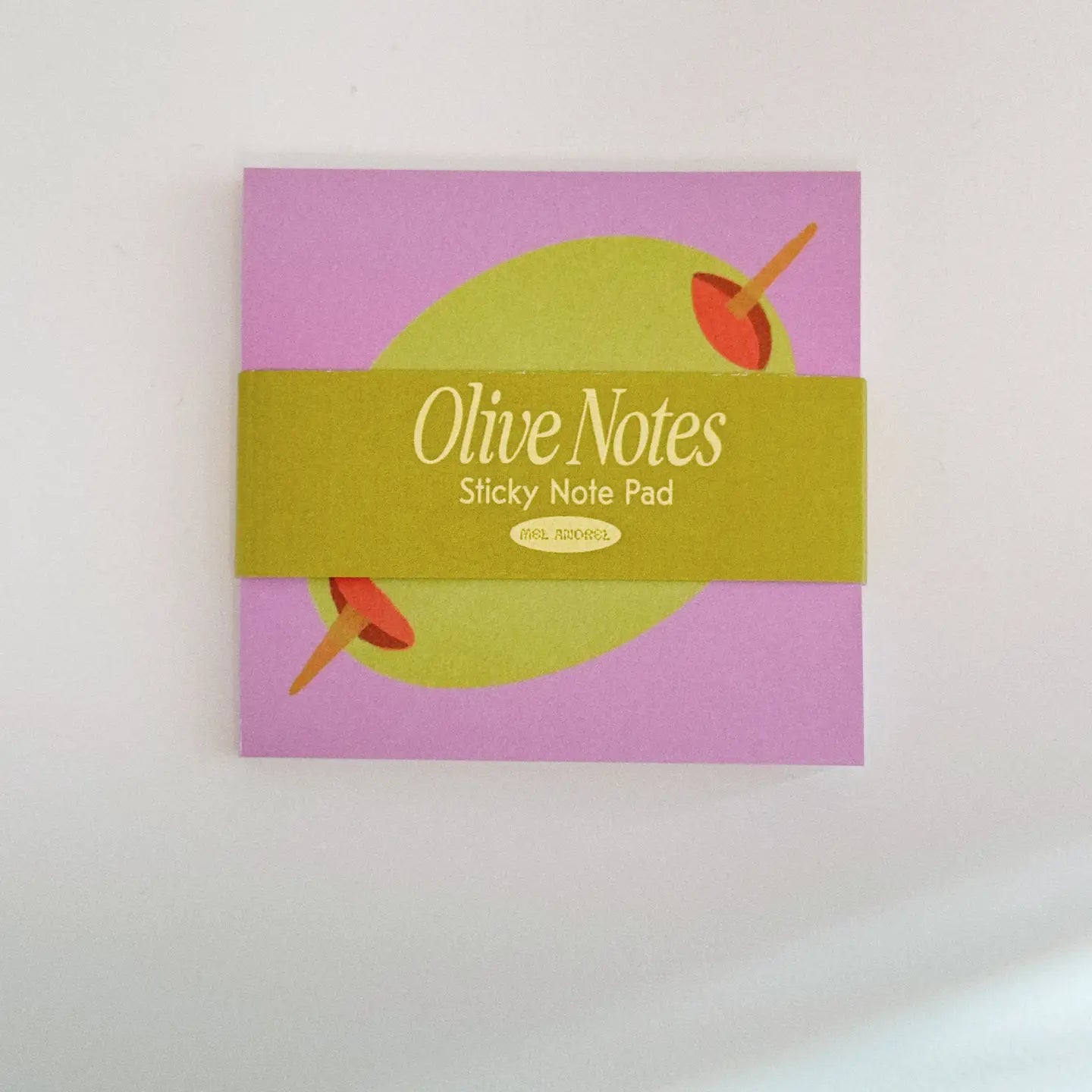unit price perthe olive sticky note pad by mel andrel is perfect for lists, reminders, or giving any writing a little personality. this 3" × 3" sticky note pad shaped like an olive on a toothpick features 50 adhesive sheets per pad and is 100% recyclable. they are great for desks, bookmarking cookbooks, breakfast nooks, or gifting. designed to stand out on a shelf or in a notebook, this sticky note pad gives life to everyday planning.