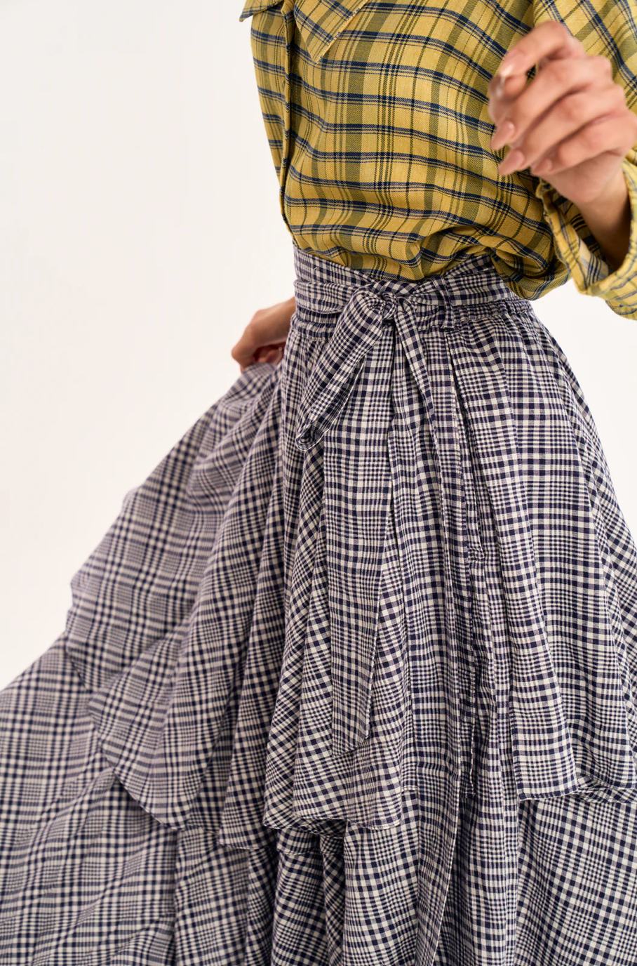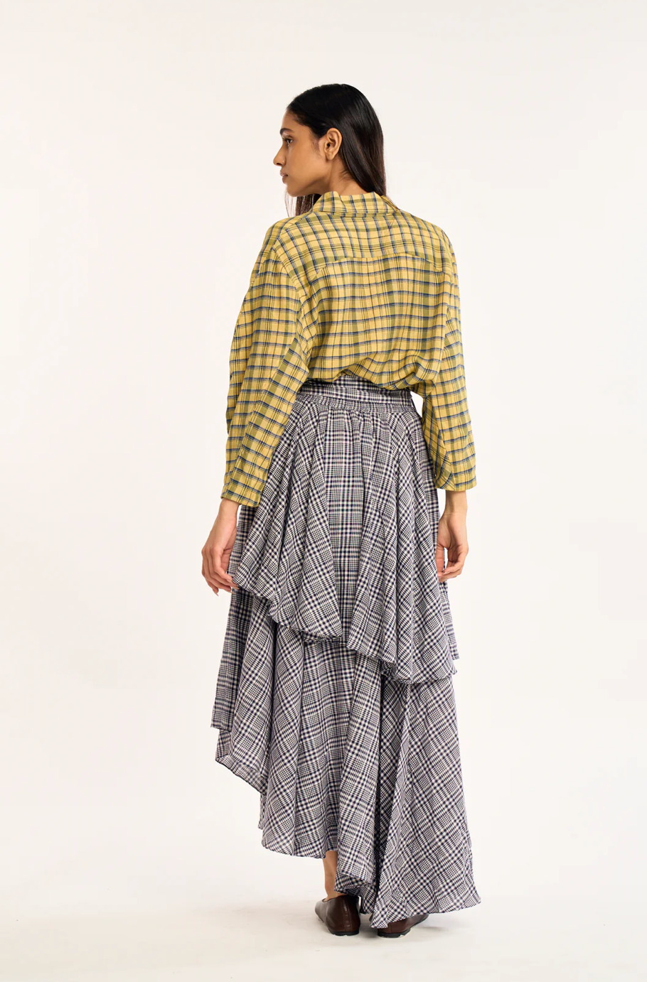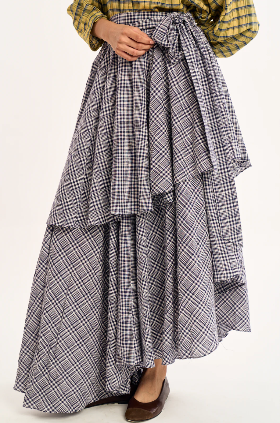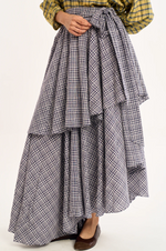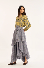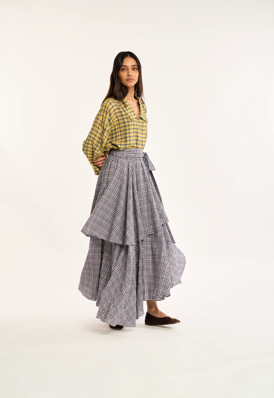 the rujuta sheath the circa skirt is a wrap style maxi skirt in a classic plaid, designed with a timeless yet modern sensibility. asymmetrical layered panels create soft movement and added depth, giving the silhouette a quiet drama as it moves. a high rise fit defines the waist and naturally elongates the frame, while an adjustable elastic back and self tie waistband allow for a flexible, personalized fit that feels easy and secure.