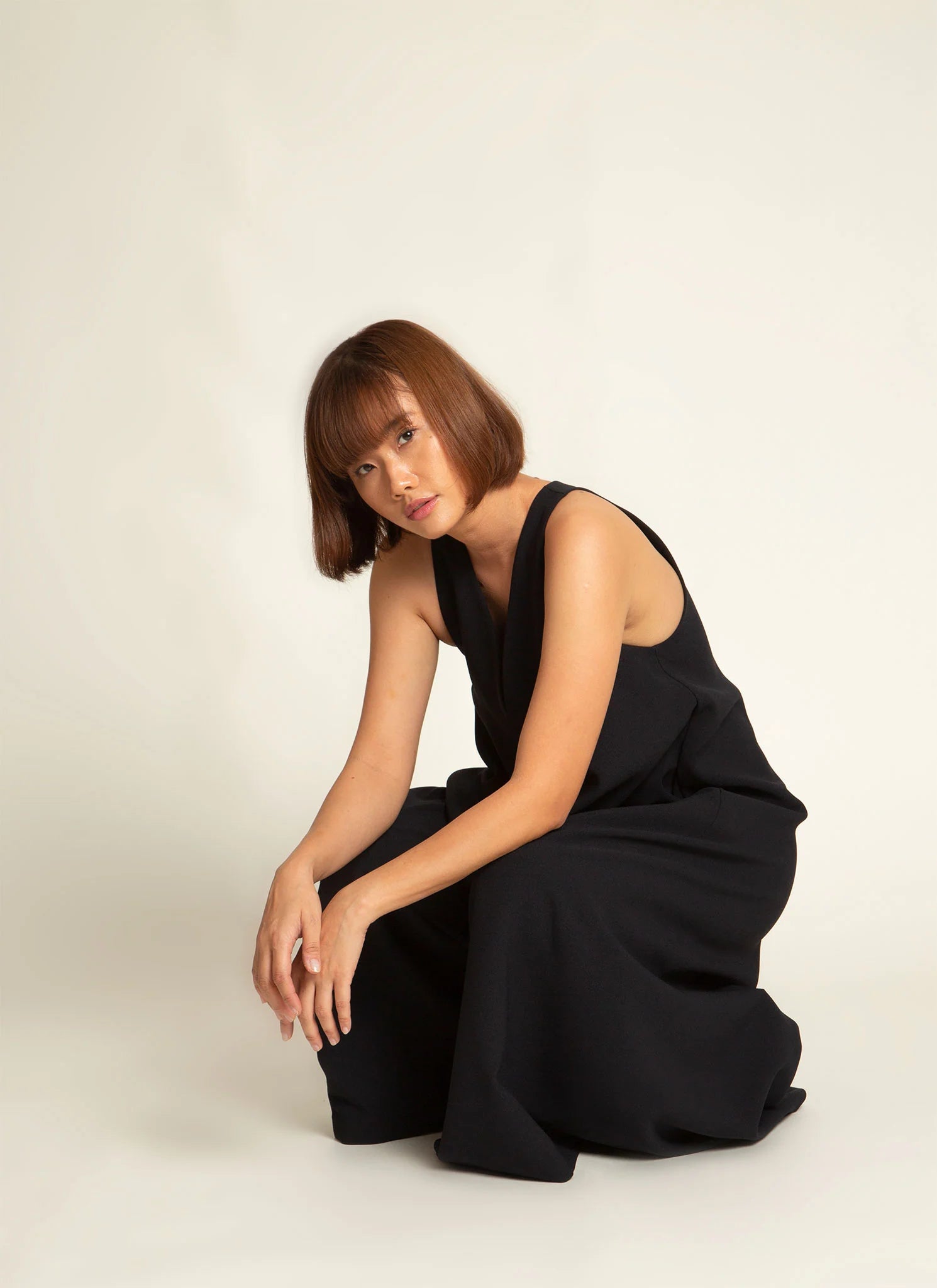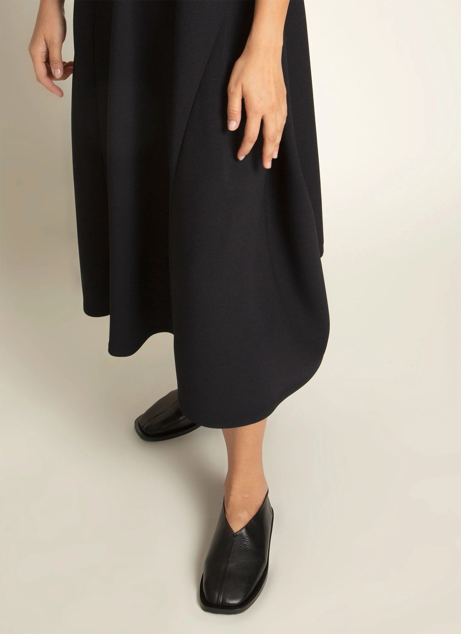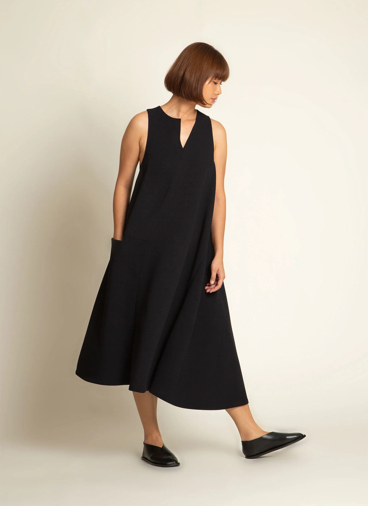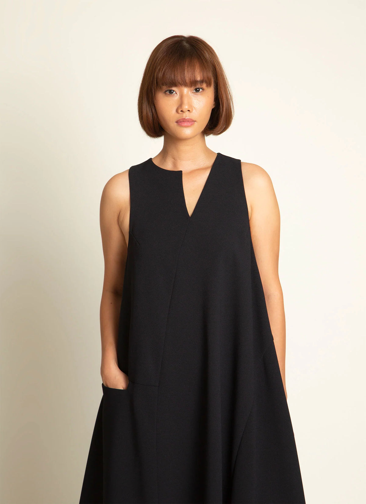 the kaarem diagonal xéo a-line pocket dress in black blue is a clean and versatile design that balances structure and ease. featuring an a-line silhouette, a separated waist detail, and a single pocket, this dress combines functionality with understated elegance. the neckline is designed with a subtle diagonal (xéo) detail, adding a unique and modern touch to the classic A-line shape.