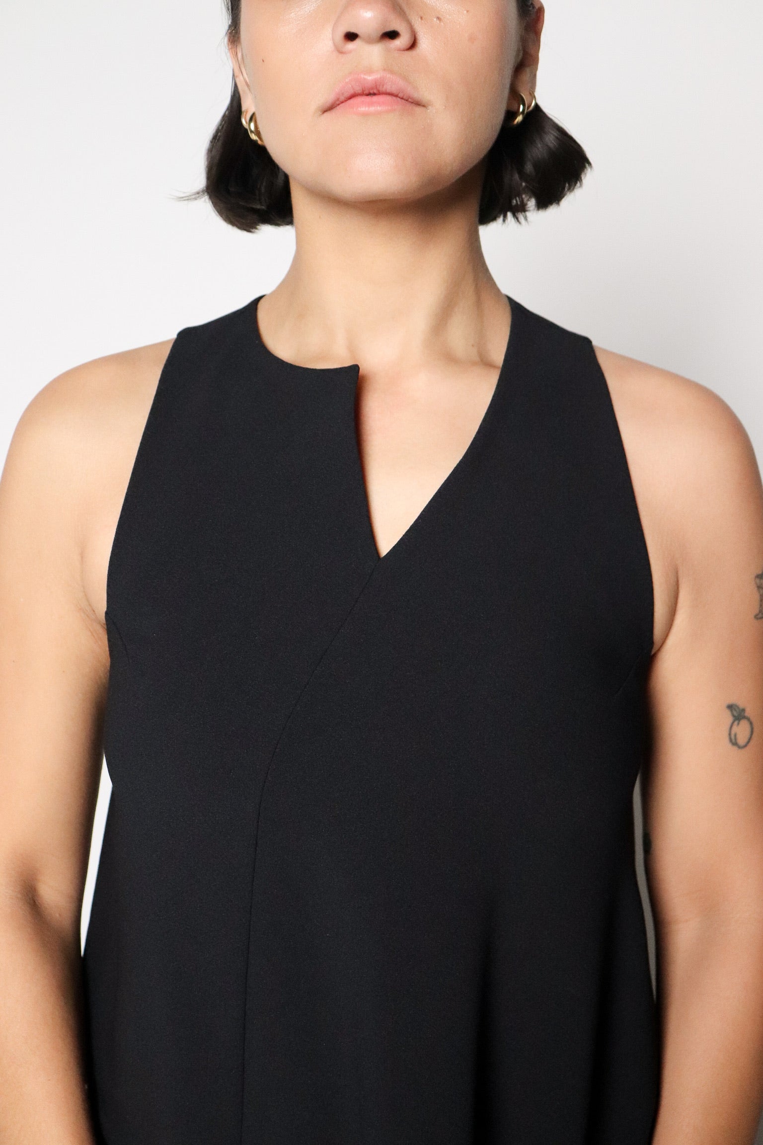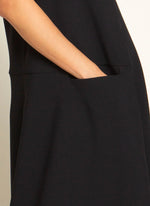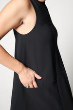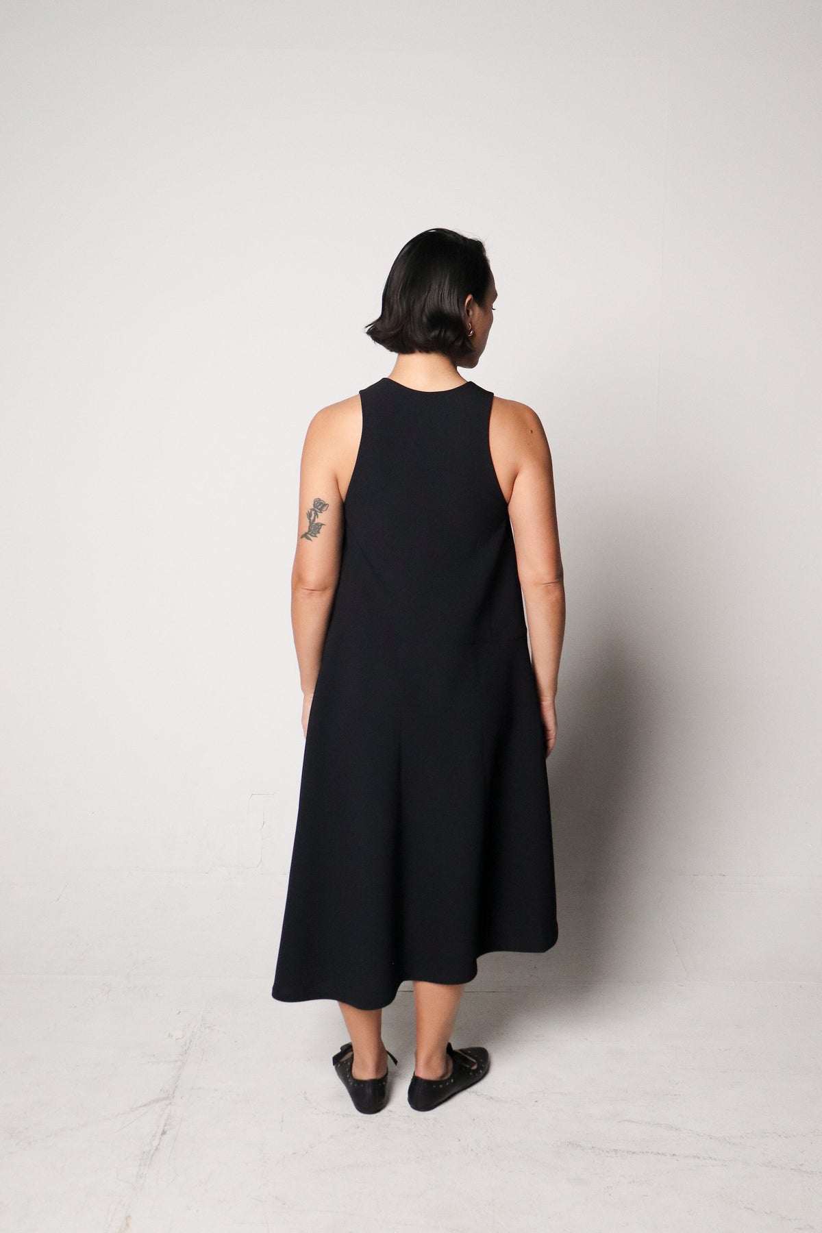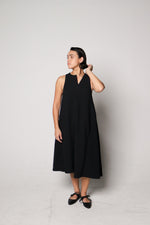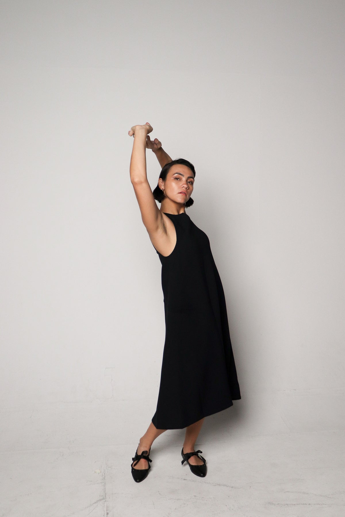 the kaarem diagonal xéo a-line pocket dress in black blue is a clean and versatile design that balances structure and ease. featuring an a-line silhouette, a separated waist detail, and a single pocket, this dress combines functionality with understated elegance. the neckline is designed with a subtle diagonal (xéo) detail, adding a unique and modern touch to the classic A-line shape.