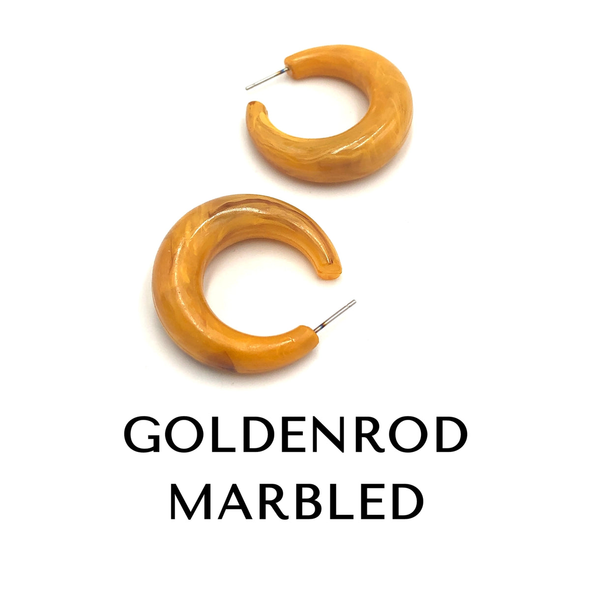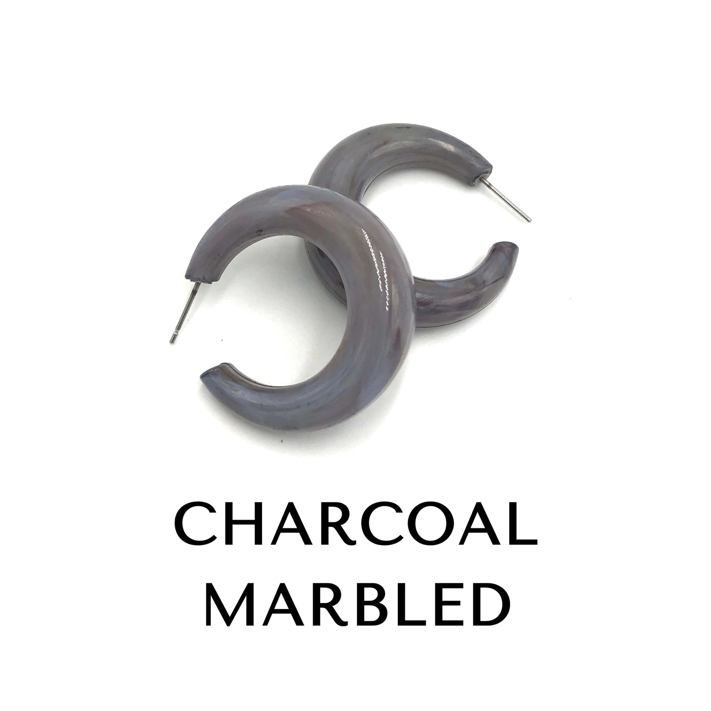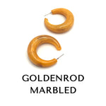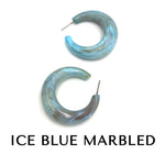 marbled, shiny, and full of personality. the megan hoops by leetie lovendale are a fantastic bulb shape that’s retro, playful, and effortlessly cool. measuring just over 1.25" (35mm) with a tapered width from 11mm to 5mm, they’re bold without being heavy. made from vintage 1980’s deadstock lucite parts, hand-set with surgical steel posts and backings, these hoops are light, fun, and perfect for adding a touch of retro-chic to any outfit.