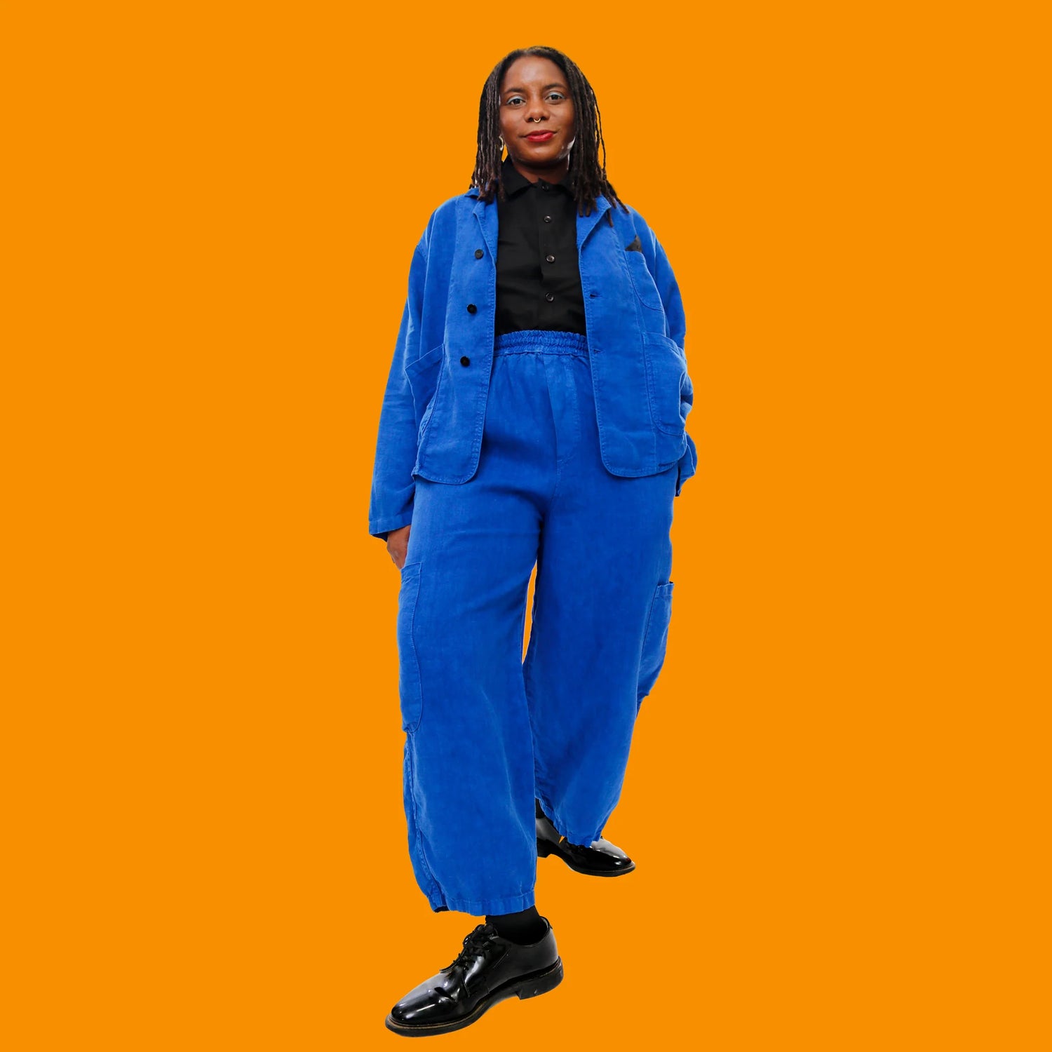 the kaarem cachuabi tomato tapered billow pocket pant in azure blue offers comfort and functionality. designed with a tapered silhouette, these pants feature a seam detail above the knee, side seam pockets, and a side zipper entry. the relaxed waist provides ease, while the roomy fit through the thigh ensures freedom of movement. cà chua bi means "cherry tomato" in vietnamese, reflecting the pant’s organic inspiration and its balance of structure and fluidity.
