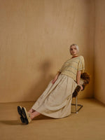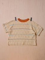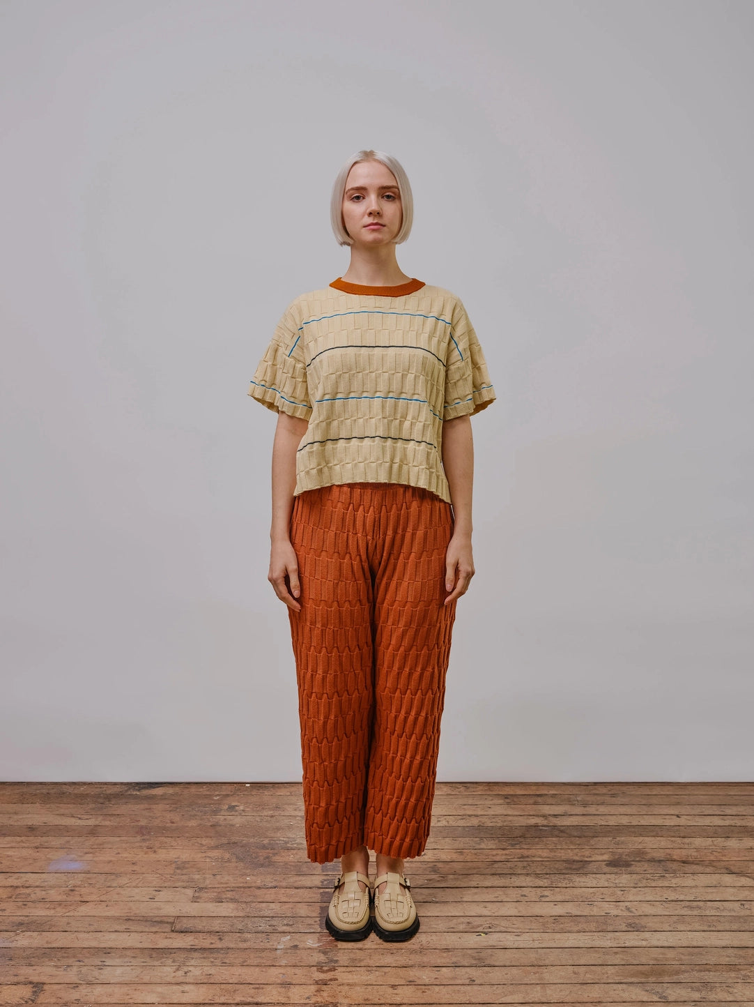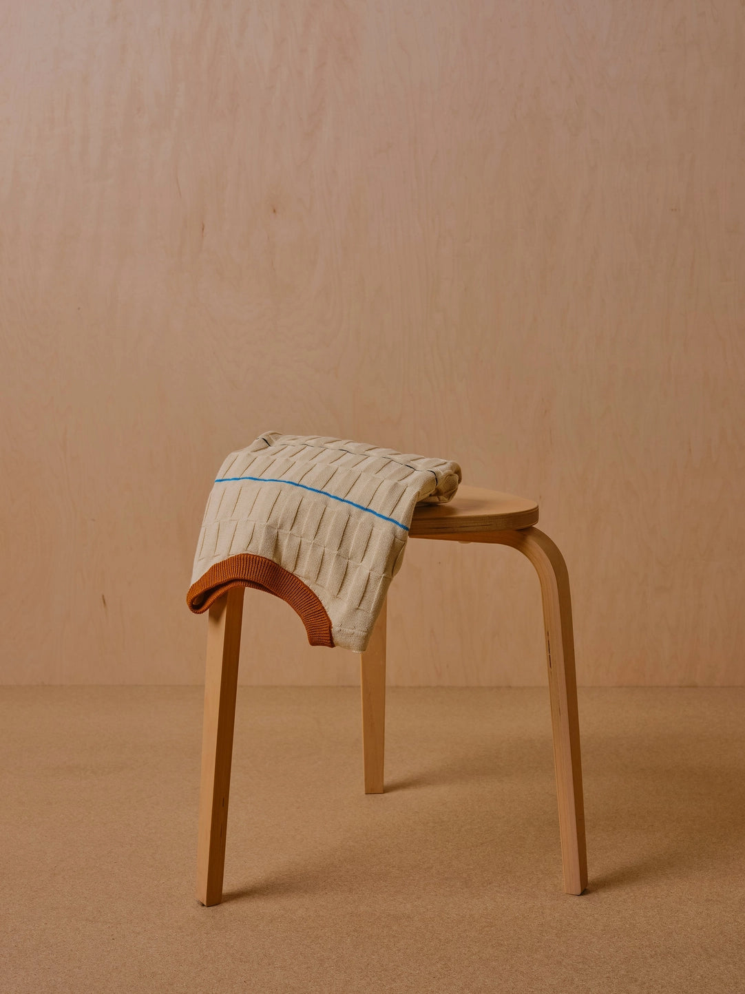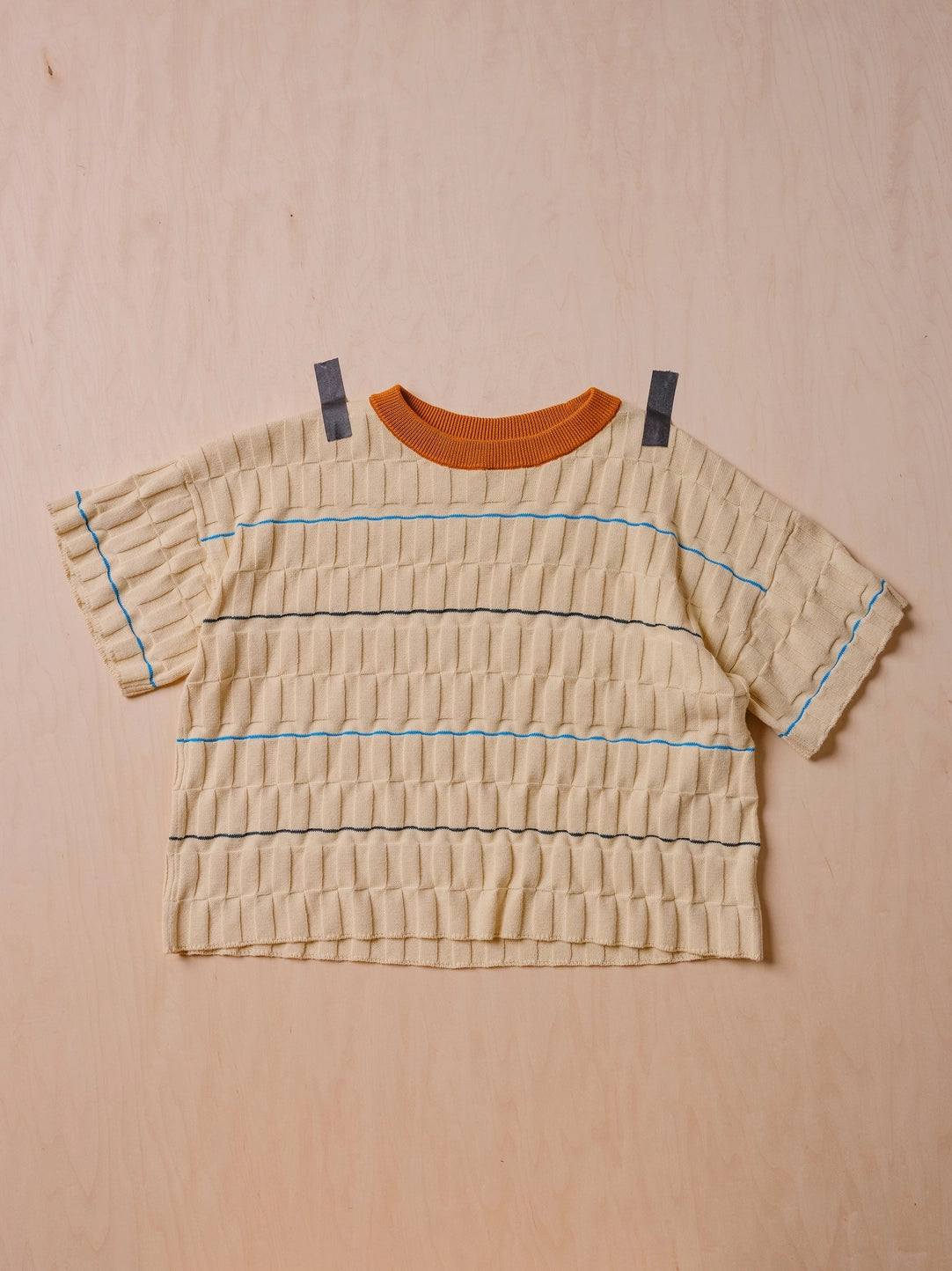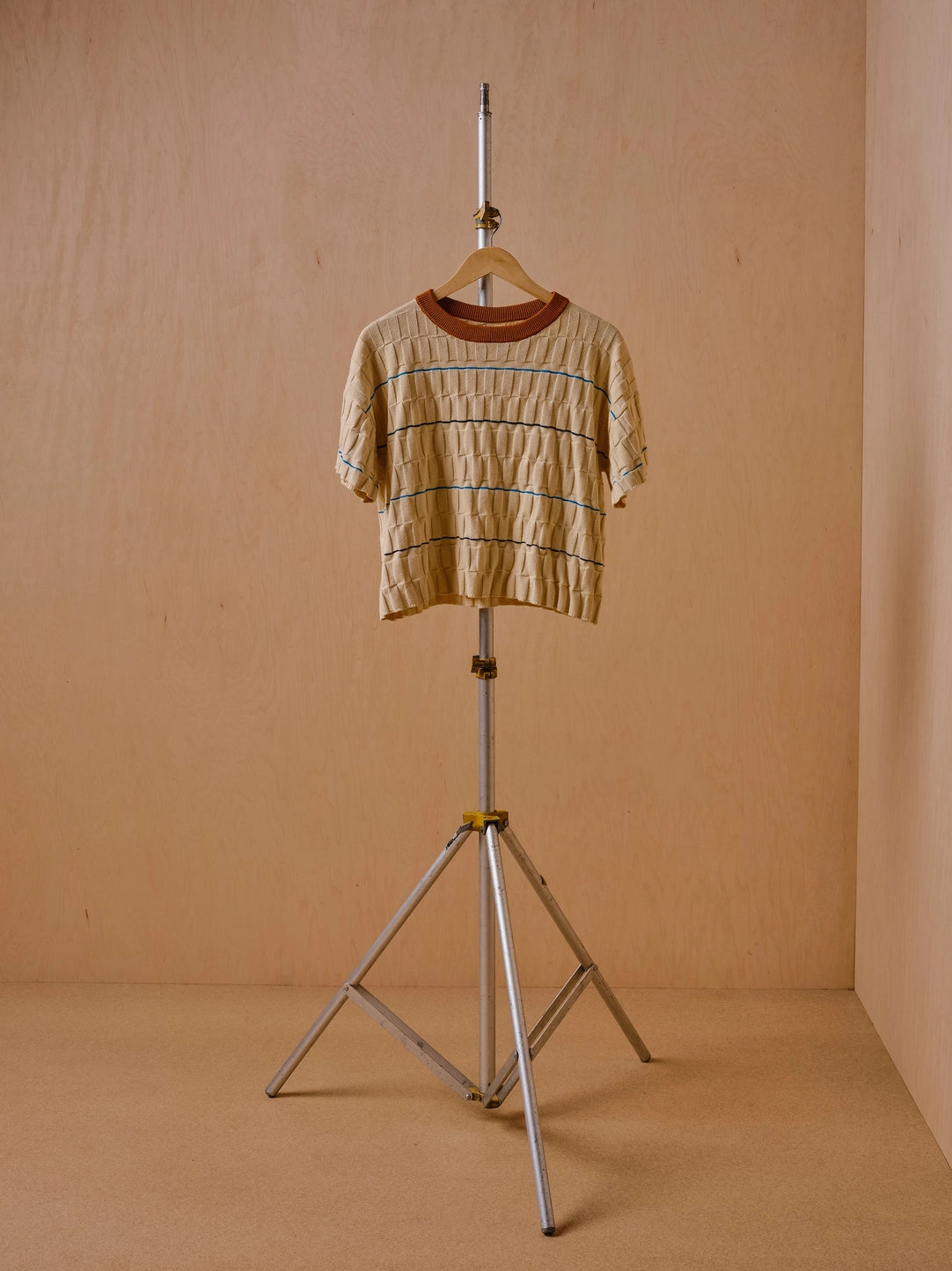 the wiggle stripe knit grid tee by the endery is a lighter-weight tee option crafted in 100% deadstock cotton/modal blend in their boxy oversized knit tee body. the rib structure + stripe combo creates a subtle wiggle to the line while the contrast collar pulls all the elements together.