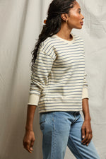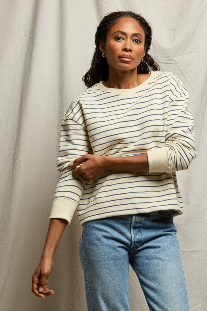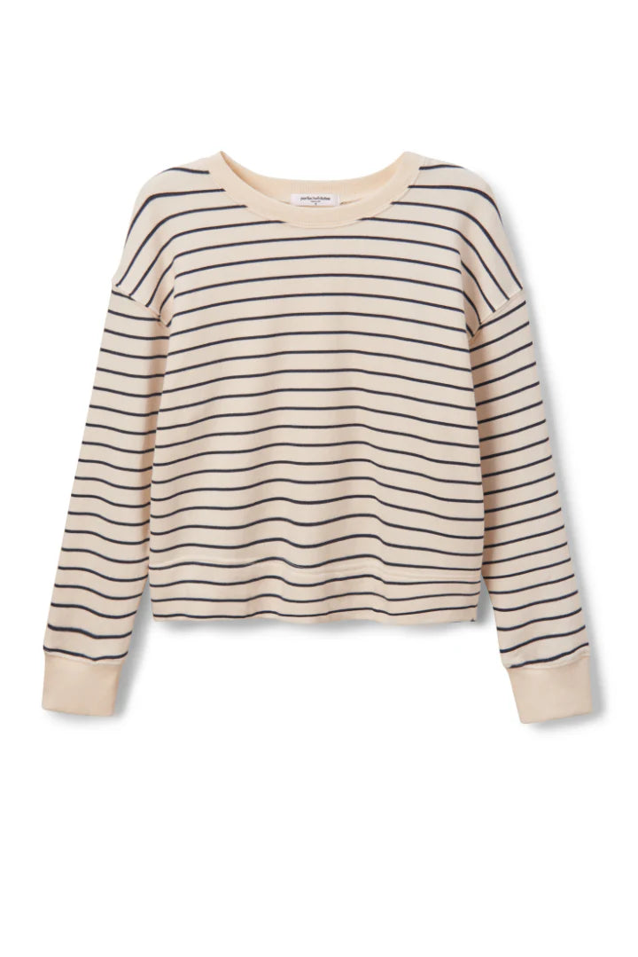 unit price perthe tyler stripe french terry pullover sweatshirt by perfect white tee is hands down going to be your new favorite sweatshirt. it features a drop shoulder and easy fit. the lightweight, relaxed vintage french terry creates the most coveted sweatshirt in your collection. it's super soft and plush with a classic sweatshirt fit that hits just below the waist. rock this sweatshirt with leggings or your favorite denim.
