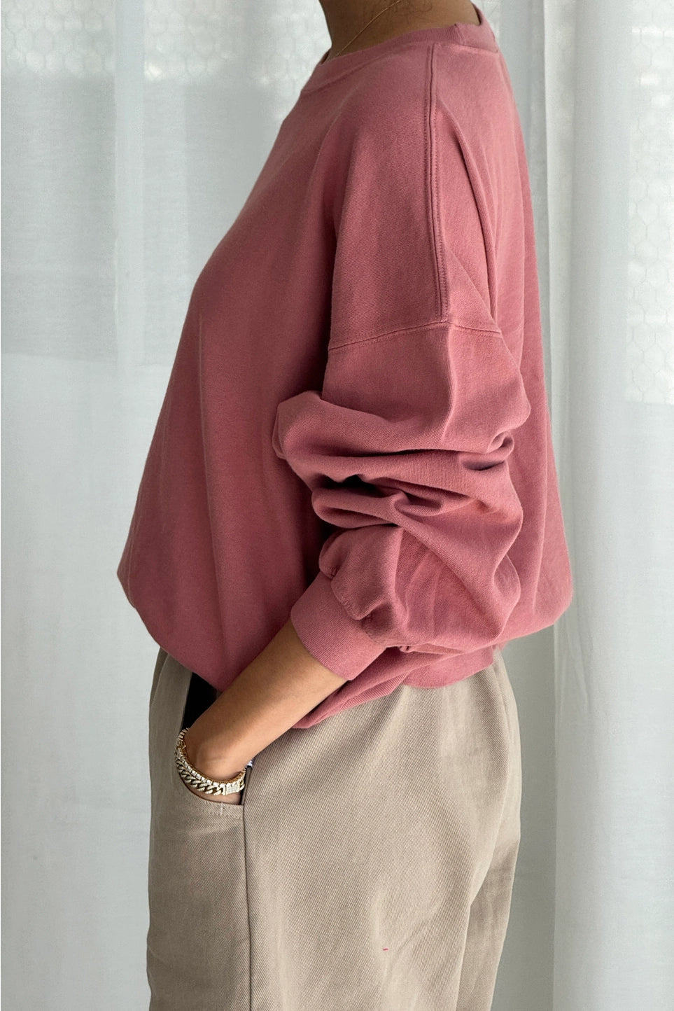 the claire sweater is 100% cotton premium jersey + fits true to size. we recommend hand wash + lay flat to dry.