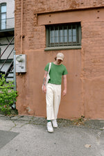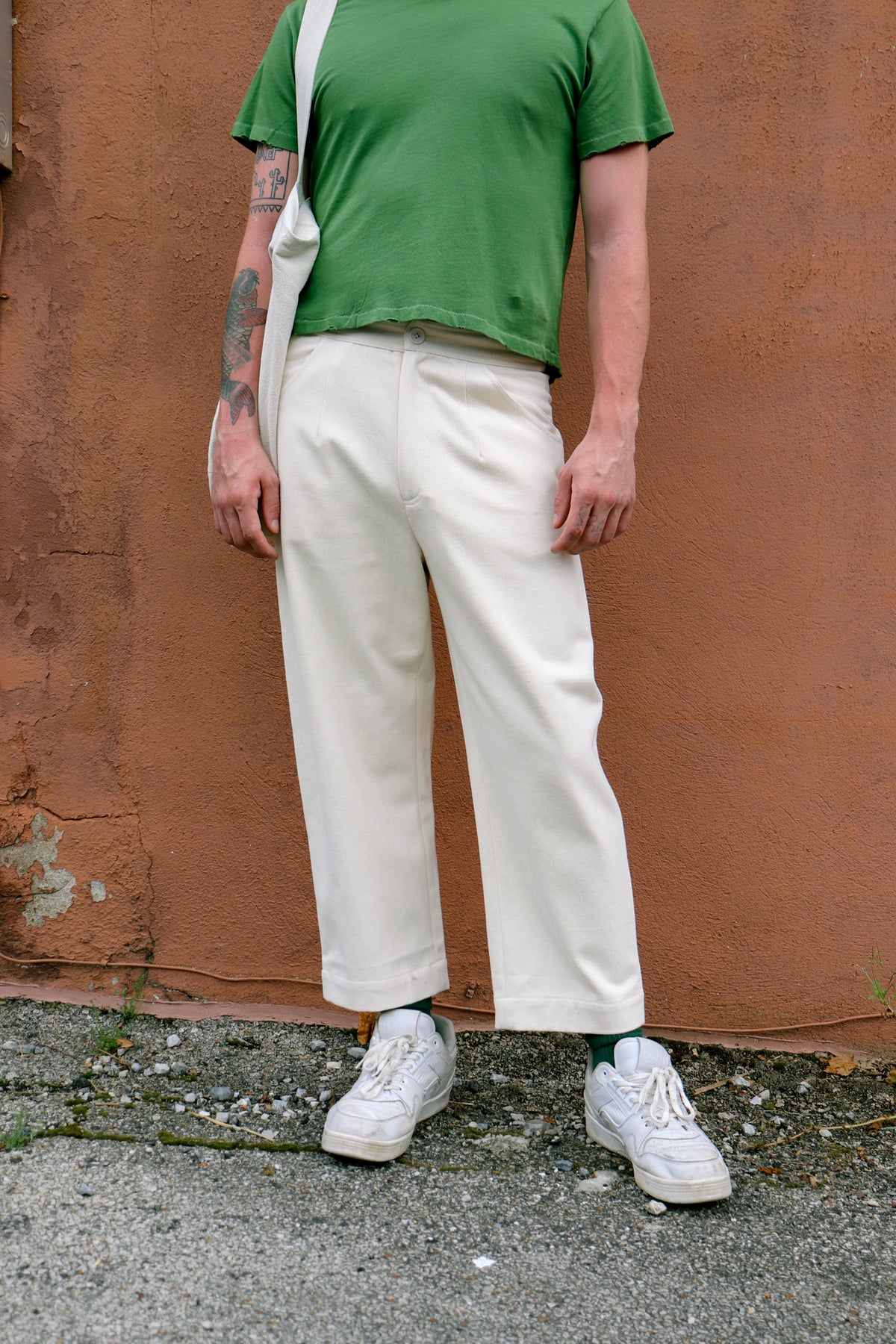 the sizing of these trousers is comparable to men's sizes to offer a unisex fit. if you are after a high-waisted look, select the size with the measurements that sit best on your high waist. if in between sizes, size down as the elasticated back and will give an additional 3-4 inches in the waist. they are 100% cotton, and we recommend gentle wash + hang to dry or dry clean only.