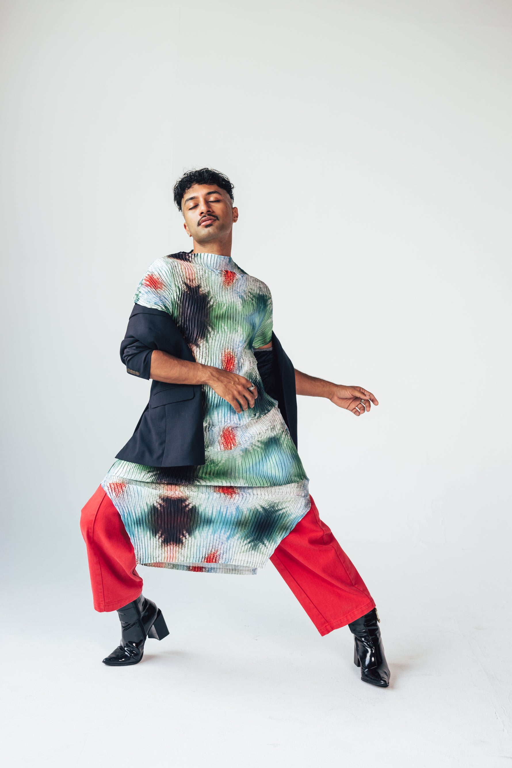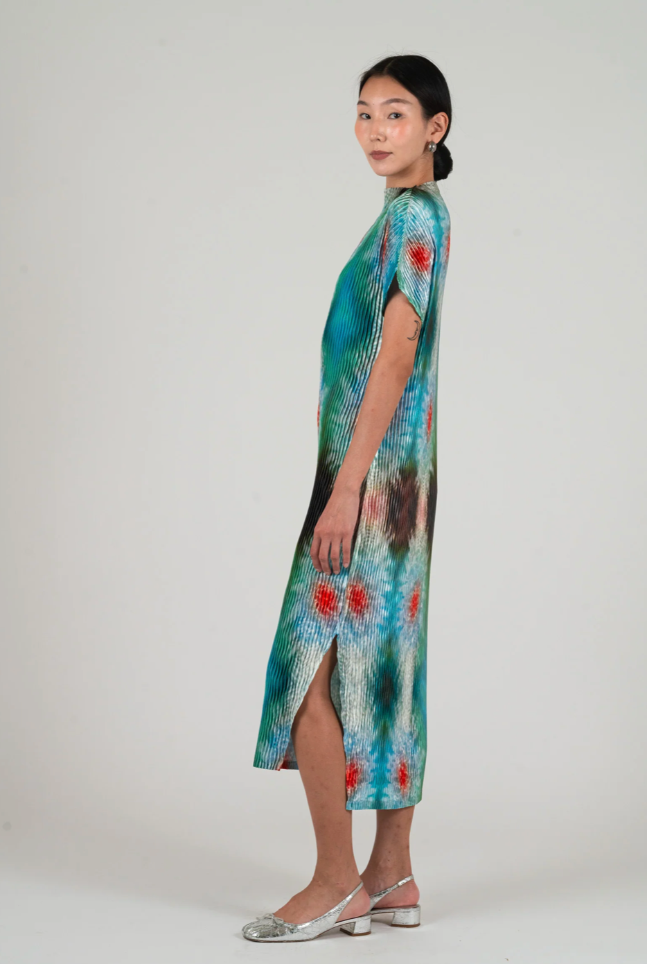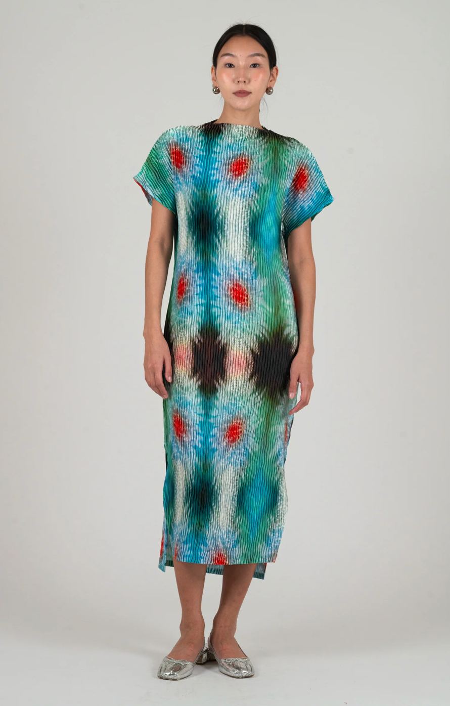 the nin studio orb dress in urchin angel is a nin classic, this mid sleeve wave pleat dress is made for all, featuring a side slit opening, a variety of unique prints, and an open neck line. unisex and versatile, this pleat midi dress is a must-have.